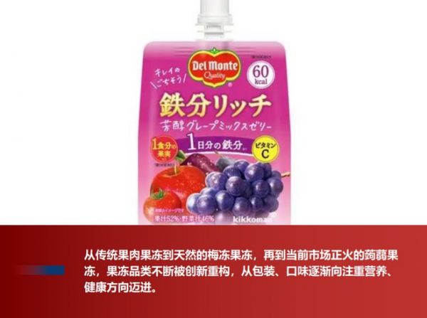 近期,龟甲万食品株式会社上新Del Monte富铁葡萄混合果冻,据介绍,该产品为葡萄风味果冻饮品,混合了葡萄、苹果和西梅等水果以及紫胡萝卜和番茄等蔬菜,一瓶(160克)可提供6.8克的铁。这为果冻饮品市场提供了更加丰富的产品选择,也反映出当前果冻饮品市场的创新正在朝着健康、营养方向发展。