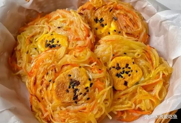 锅内加少许油,将土豆丝放进锅内,用筷子整理成甜甜圈的形状,再将蛋黄倒进圈内。也可以放入整个鸡蛋。