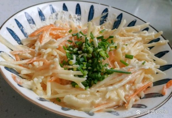 土豆去掉外皮,冲洗之后擦成细丝,加少许盐搅拌均匀,腌制几分钟,变软塌后更容易加面粉,喜欢口感丰富一些,还可以添加少许胡萝卜丝。