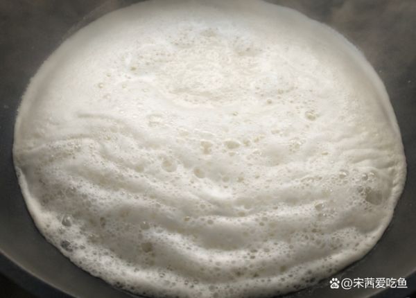 五分钟之后,将豆浆表面的泡沫去掉,关火后等待一分钟,时间到了将内酯液体倒进豆浆中。