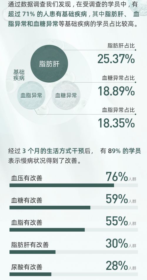 通过数据调查发现,参与长轻健康生活方式的用户中有超过71%的人患有基础疾病,如脂肪肝、血脂异常和血糖异常等。但在经过为期3个月的长轻健康生活方式干预后,有89%的用户表示慢病状况得到了改善。