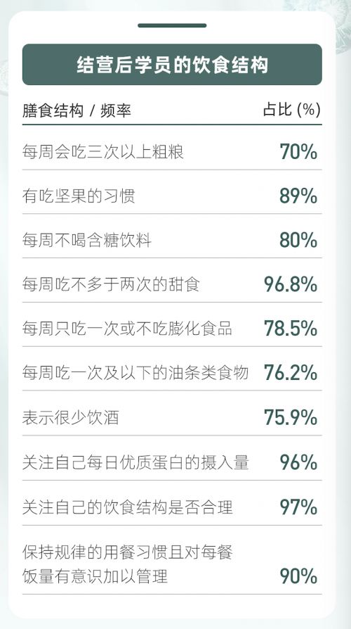 此外,《健康生活方式在体重管理实践中的效果评价》报告显示:参与“健康生活方式”干预后的用户,其在结营后膳食结构亦明显优于全国膳食调查城市居民的表现。且在饮食结构上更注重营养均衡、膳食搭配等健康原则。