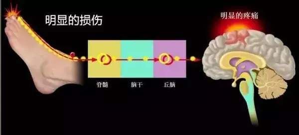 如图所示,当人的脚受到某种损伤时,刺激会被神经传导至脊髓、脑干、丘脑,最后到达大脑皮层,产生疼痛的感觉,这是一种单纯的生理性疼痛。