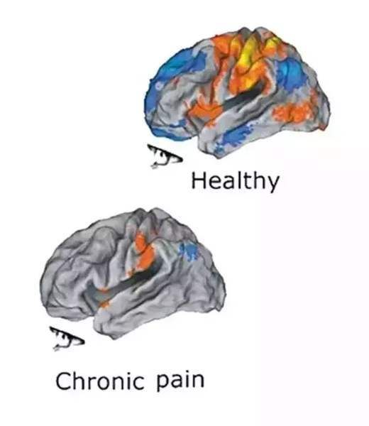 ▲上图为健康的大脑,下图为长期遭受慢性疼痛的大脑