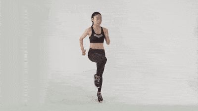 身体保持站立的姿势,肘关节弯曲放置在身体两侧,双手握拳。双腿跑动起来,努力抬高。抬高至大腿与地面保持平行的状态即可。注意调整呼吸的节奏,腰腹部核心收紧,尽量脚尖点地。