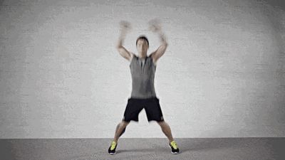 身体保持站立,双手从身体两侧向上挥动,在头顶上方交叉或击掌,双脚向外跳开。腰腹部核心收紧,保持重心稳定。