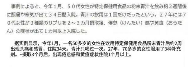 传闻,前几年的新闻报道中就有关喝青汁导致肝衰竭的事件。一位50多岁的女性再喝完保健品青汁后,感到呕吐犯恶心,随后住院治疗一个多月。更可怕的是,日本也曾曝出喝青汁减肥的虚假广告,后来被处罚一亿日元以此警戒。
