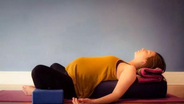 瑜伽训练者在进行仰卧束角式训练时,可以通过借助瑜伽砖来支撑大腿,以此来减少来自腹股沟处的压力。在运动过程中,瑜伽训练者要注意两臂应向身体两侧展开,掌心向上,将身体慢慢打开,拉伸身体上半部分。对于颈椎不好的瑜伽训练者来说,可以在颈部下方垫一块毛巾,减少颈部发力。