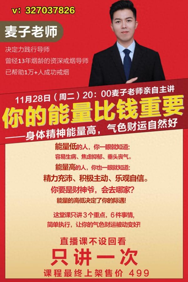 11月28日周二晚上8点,直播开讲课程《你的能量比钱重要》,到时会把这几个方面的技巧,完整分享给你!
