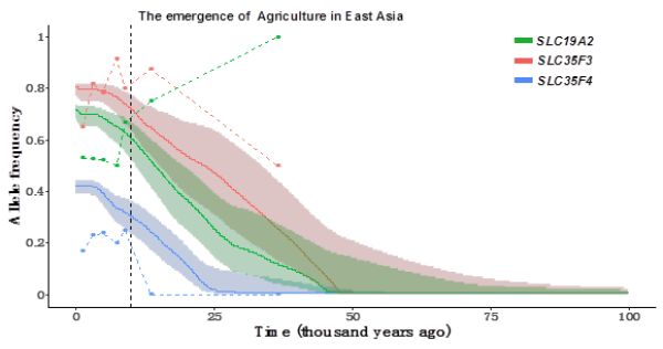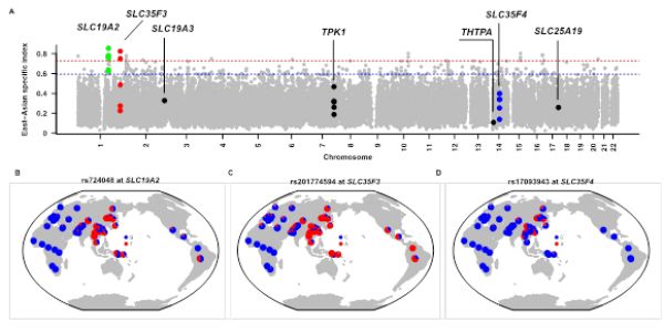 该研究发现维生素B1代谢通路相关基因(SLC19A2、SLC35F3、SLC35F4)在东亚人群受到特异性的正向自然选择,其中有的适应性单倍型源自现代人祖先和已灭绝的尼安德特人或类似远古人类的基因交流,并推断东亚人群特异性的适应性进化可能发生在东亚地区农业文明之前,提示农业大规模发展以后东亚人群饮食结构的改变并非适应性进化的原初进化驱动力。