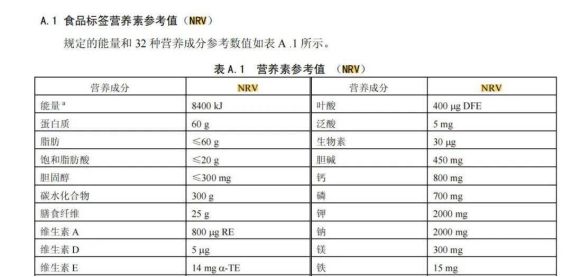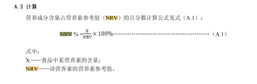 营养素参考值(NRV,Nutrition Reference Values)是用于比较食品营养成分含量高低的参考值,“营养素参考值”和“NRV”可同时写在营养成分表中,也可只写一个,如“营养素参考值(NRV)%”、“营养素参考值%”或“NRV%”。