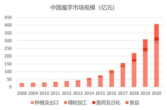 中国魔芋协会的数据表明,2020年中国魔芋整体市场规模已经突破了400亿元,2010-2020年复合增长率约为26%。同期,日本仅魔芋深加工市场规模约1500亿日元(约合88.4亿人民币),人均魔芋消费金额约70元,而中国人均魔芋产品消费金额仅为7.6元。再如魔芋精粉消费量,2020年中国大陆人均魔芋精粉消费量不足0.1kg,相比于周边国家也处于较低水平,不足日本的二十分之一。