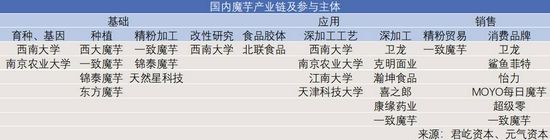 君屹资本的资料显示,魔芋产业链的基础主要有四个方面,包括育种、基因、种植、精粉加工以及改性研究。其中种植和精粉加工领域的规模企业相对较少,如西大魔芋、一致魔芋、和锦泰魔芋等,而一致魔芋也在尝试打通全产业链条。受限于魔芋产区地形和进入流通的限制,魔芋种植和初加工企业多呈现产区聚集性,且尚未形成规模化。