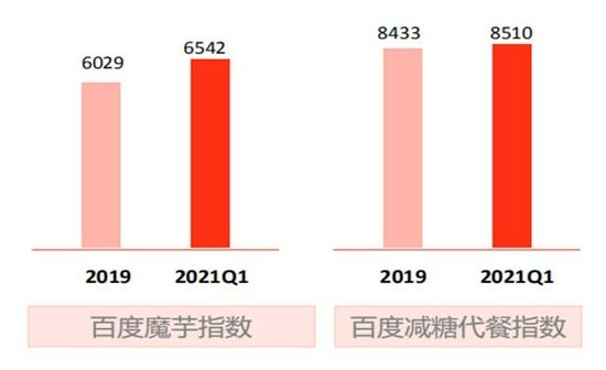 百度搜索指数数据显示,魔芋指数和减糖代餐指数常年居高不下,反映出消费者对于魔芋功效的认知正在逐步建立。