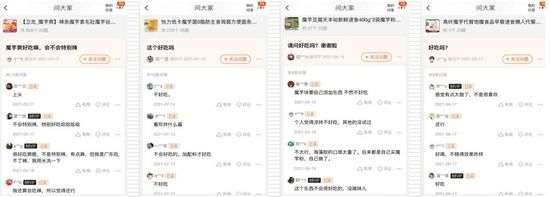 从主流热销的魔芋制品的问答信息分析看,消费者的“吃货”心态超过了所谓“健康”的诉求。而市场上主要在销产品中多数并不好吃,只有在搭配酱料后才能为更多人所接受。