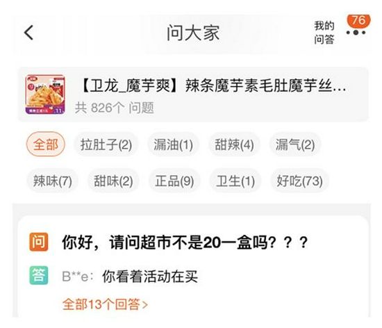 同样的,爆款产品卫龙魔芋爽的后台问答就更有意思,826个问题关键词提取后的结果中甚至并没有跟热量和健康本身相关的提问,而好吃在检索结果中出现最高为73次。