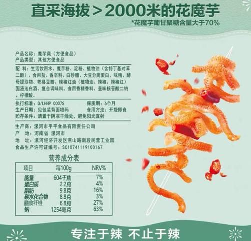 除此之外,虽然魔芋作为食材本身有低热量等多种健康特质,但是魔芋深加工制品可能也并非要靠“健康”取胜。以爆款产品魔芋爽为例,配料表上,主要能反映出的是它的营养价值,用了很多的盐及各种调味品、香精、香料。
