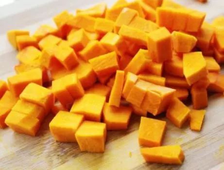 2、注意淘洗小米的时候,不要用力搓,也不要洗的次数太多,这样会导致小米的营养流失,如果担心不干净,最多洗两遍就可以了,南瓜切成比较小点的块,这样也更方便熬煮,小米和水的量也有很有讲究,按照米和水1:7的比例即可,水不要太多,否则粥不浓稠也不好喝。