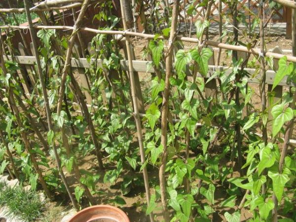 支架引蔓:山药出苗的时候就需要将搭支架以引蔓。搭架引蔓能够使山药植株能够透光、透风,并且能够避免藤蔓伏地生长。一般采用树枝或者细竹竿搭起人字架子,架高2~2.5m。因为山药藤蔓较长。在材料及场地限制时,也不能够低于1.5m。支架要坚固,以避免山药植株倒伏。