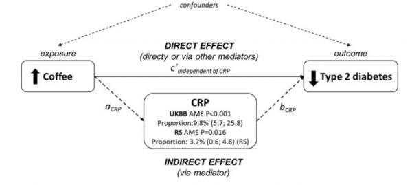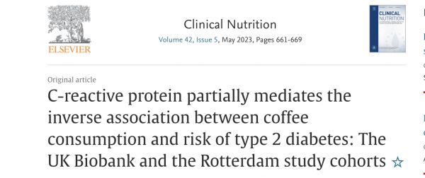 Carolina Ochoa-Rosales. et al. C-reactive protein partially mediates the inverse association between coffee consumption and risk of type 2 diabetes: The UK Biobank and the Rotterdam study cohorts. Clinical Nutrition.2023. https://doi.org/10.1016/j.clnu.2023.02.024