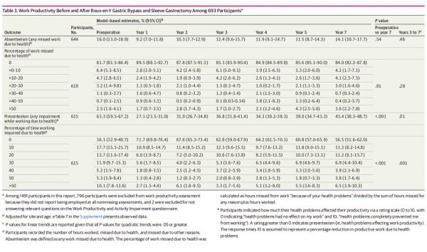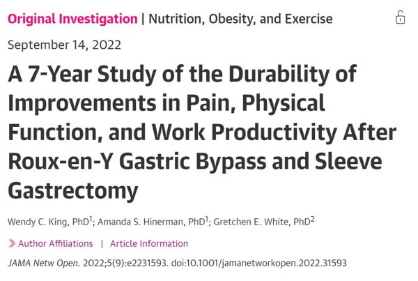 King WC, Hinerman AS, White GE. A 7-Year Study of the Durability of Improvements in Pain, Physical Function, and Work Productivity After Roux-en-Y Gastric Bypass and Sleeve Gastrectomy. JAMA Netw Open. 2022;5(9):e2231593. doi:10.1001/jamanetworkopen.2022.31593