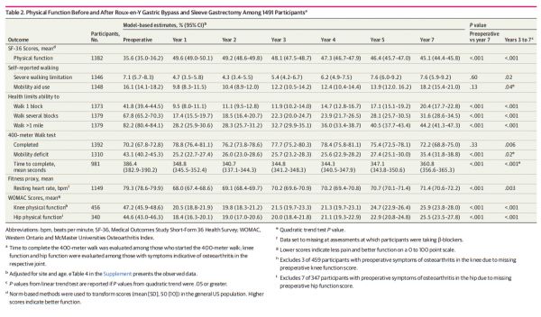 美国一项大型多中心队列研究——减肥手术纵向评估-2 (LABS-2)的研究人员此前报道了减肥手术后1 - 3年身体和关节特异性疼痛、身体功能和工作效率的术前至术后变化。本报告讨论了改善的持久性,重点关注了在Roux-en-Y胃旁路手术(RYGB)和袖状胃切除术(SG)后,成年人在疼痛和身体功能方面是否有长期的临床重要改善(CIIs) 。