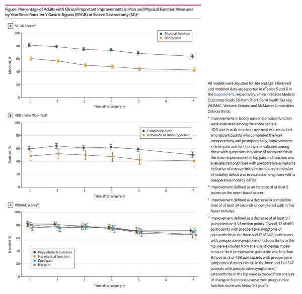 总的来说,在这个接受RYGB或SG治疗肥胖的大型美国成人队列中,尽管在随访中,术前到术后的改善有所下降,但在术后7年,感知身体和关节特异性疼痛以及自我报告和客观测量的身体功能的cii在41%到72%之间,取决于测量方法和亚组,这表明RYGB和SG通常与疼痛和身体功能的长期改善有关。