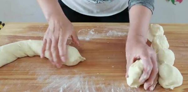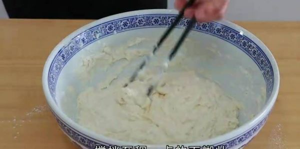 20分钟后。我们给它搅拌一下,加入少许的小苏打,把小苏打充分的搅拌均匀,再次加入少许的面粉,用筷子再次搅拌,再加入少许的面粉,揉成一个光滑的面团,盖上盖子,再次发酵10分钟,看一下面已经发酵好了,明显变大。还有这种蜂窝组织,取出行好的面团,多搓揉几下,给它排干净里面的空气,把面团直接搓成长条状,揪成大小均等的面积,
