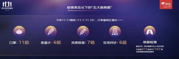 京东健康数据显示,今年"11.11期间(11.1-11.10)",京东健康口罩订单量同比增长了11倍、体温计订单量同比增长了6倍、流感疫苗订单量同比增长了7倍,在线问诊订单量同比增长了6倍。