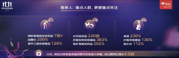进入秋冬季,为了守护自己和家人的身体健康,不少用户期待更为全面、细致的家庭健康管理服务,以度过充满变数的"严冬"。因此,在这次京东11.11中,京东健康推出了"家庭关爱计划",以家庭生活为场景,从体检、问诊、用药、养生等多个方面为用户提供全套服务。今年11月1日—11月10日,京东健康全新升级的家庭小药箱,成交额同比增长了4.5倍。