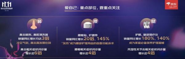 此外,随着季节变换和气温降低,一些秋冬季高发病也使得更多人开始关注自己的"重点部位"。今年11月1日—11月10日,鼻炎相关症状问诊量同比增长了近6倍,鼻炎喷剂、鼻腔清洗器销量同比增长均达3倍;腰椎相关症状问诊量同比增长了近4倍,腰椎贴、护腰带销量分别同比增长20倍和145%;风湿性关节炎相关症状问诊量也同比增长了近4倍,护膝、腿部理疗仪销量分别同比增长了180%和140%。