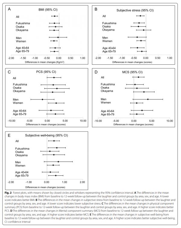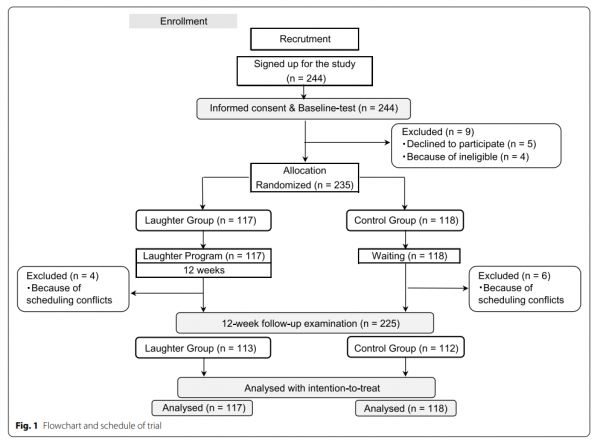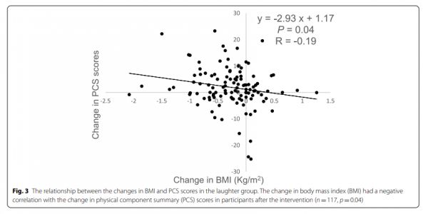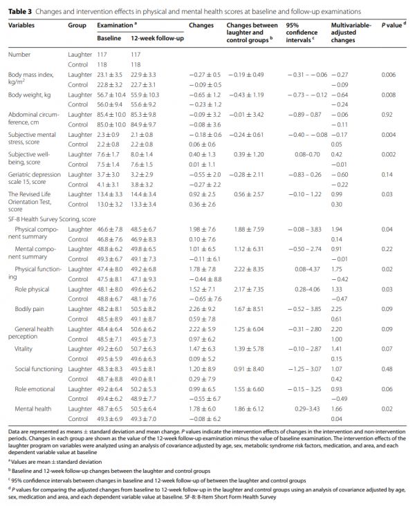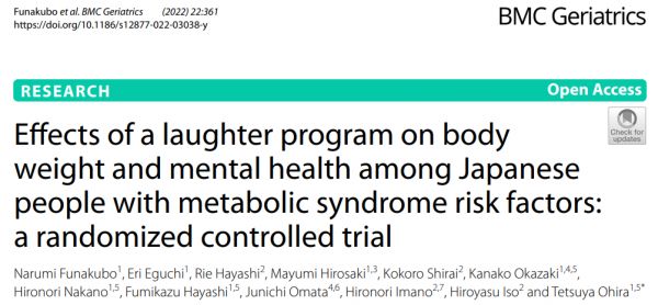 Funakubo N, Eguchi E, Hayashi R, et al. Effects of a laughter program on body weight and mental health among Japanese people with metabolic syndrome risk factors: a randomized controlled trial. BMC Geriatr. 2022;22:361. Published 2022 Apr 23. doi:10.1186/s12877-022-03038-y.