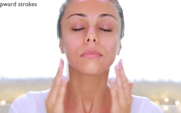 step2.从下颌开始提拉脸部至额头,手动抵抗地心引力,让全脸下垂的肌肉和皮肤都弹回去。