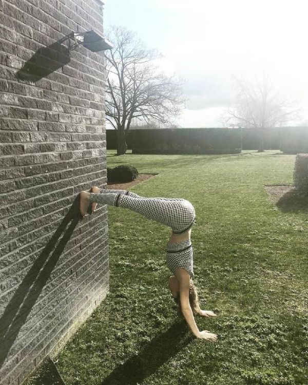 2.上身和臀部抬高,双腿向上伸展,直到上半身垂直于地面,双腿绷直保持水平,双脚脚掌紧贴墙面;