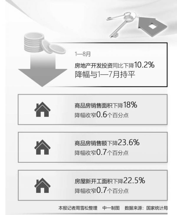 近日,国家统计局发布的数据显示,1—8月份,新建商品房销售面积60602万平方米,同比下降18.0%,其中,住宅销售面积下降20.4%。新建商品房销售额59723亿元,下降23.6%,其中,住宅销售额下降25.0%。尽管总体数据依然呈下降趋势,但在一系列政策措施作用下,一些指标呈现出边际收窄的态势。目前,楼市仍在持续调整之中。