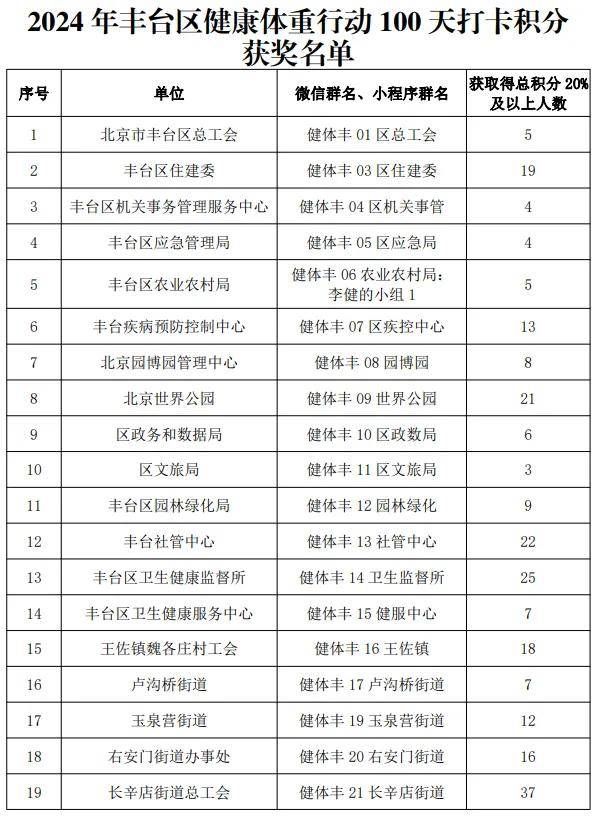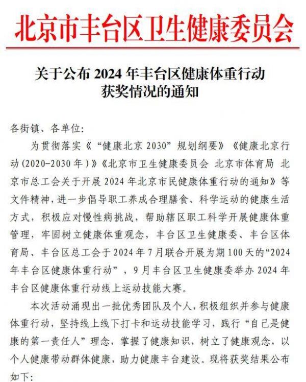 本次活动涌现出一批优秀团队及个人,积极组织并参与健康 体重行动,坚持线上线下打卡和运动技能学习,践行“自己是健康的第一责任人”理念,掌握了健康知识,树立了健康观念,以个人健康带动群体健康,助力健康丰台建设。现将获奖结果公布 如下: