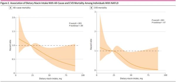 为了验证这一观点,中山大学的研究团队开展了一项队列研究,使用了美国国家健康和营养调查(NHANES)的数据,根据膳食烟酸摄入量将患NAFLD的参与者分为三组,分析结果显示,与摄入量最低(≤18.4mg/天)的一组参与者相比,摄入量最高(≥26.7mg/天)的一组参与者全因死亡风险显著下降30%。