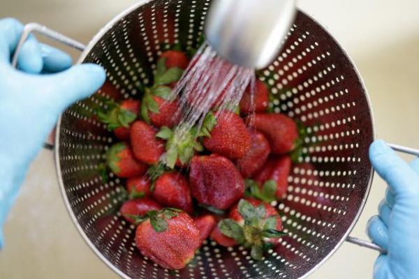 3. 流动水冲洗:将草莓从水中捞出,放在漏网上,用流动的自来水冲洗草莓表面。这样可以确保草莓表面的农药残留和细菌被彻底冲洗干净。