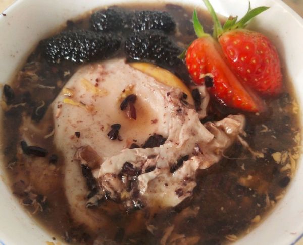 补气血的营养早餐,早上空腹吃,女孩子的福利,特别适合经期后! 材料:黑糯米酒糟,红枣,桂圆肉,姜,鸡蛋,枸杞,红糖。(桑葚果和草莓刚好家里摘的,就搭配了)。 在简单的说下这些材料的历史吧! 黑糯米:同事家自种,没经过深层脱壳加工,更好的保留了自身的营养价值。黑糯米营养价值好高,补血通气,补肾健脾。 黑糯米酒糟:我爸自酿的酒糟,这白酒也是从老爸朋友处买的,他家自制。 桂圆肉:含有多种营养物质,有补血安神,健脑益智,补养心脾的功效。桂圆肉是我自己亲手挑的,家人烘焙,健康食物。比市场上富含添加剂的好吧! 鸡蛋:亲戚家送的,都是自家鸡生的蛋,吃起来香,蛋黄结实,口感和市场上买的完全有区别。 姜:黄姜,妈妈种的。据说黄姜比大姜好很多。 红糖:出产甘蔗,红糖季买的,自我感觉还是超纯正。 红枣,枸杞,商场买的。广东人,自产不了,莫见怪! 桑葚果和草莓,家里种的,今早新鲜摘下来! 这样的早餐是不是超完美呢!