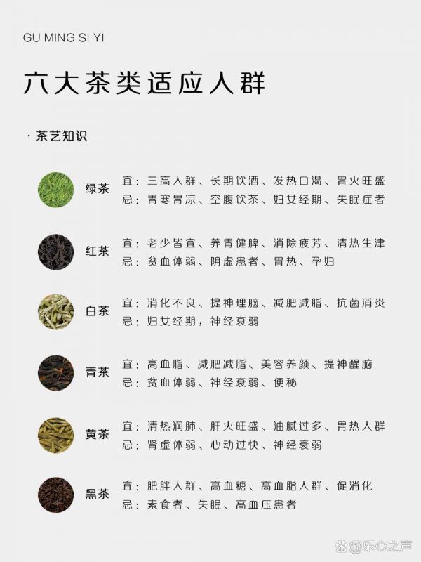 六大茶类分为不发❤️酵茶、半发❤️酵茶、全发❤️酵茶和发❤️酵茶,其中不发❤️酵茶性偏寒,适合火气大、消化不好人群,可促消化,缓干燥;半发❤️酵茶适合精神欠佳、油腻人群,可提神醒脑,提高代谢;全发❤️酵茶与后发❤️酵茶适合肠胃虚寒、气色欠佳人群,可暖胃抗寒,补充营养物质。