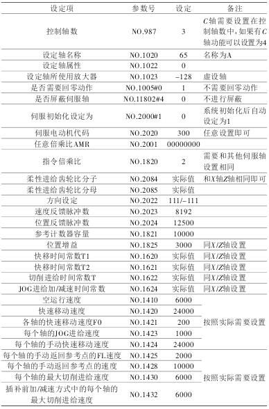 柔性同步控制在车削断屑中的重要目的为将虚设轴的振荡动作与伺服轴的正常指令进行叠加,从而实现断屑的效果。控制中以虚设轴A轴作为其主动轴,需要进行振荡的伺服轴设置为从动轴,最多可以设置4组。柔性同步控制同样为选项功能,0i-TF中订货号为A02B-0339-S709,诊断号为1292#0。31i B系统订货号为A02B-0327-S709,诊断号为1268#1。下面设置以标准车床为例,设置两组振荡轴,其设置如表3所示。