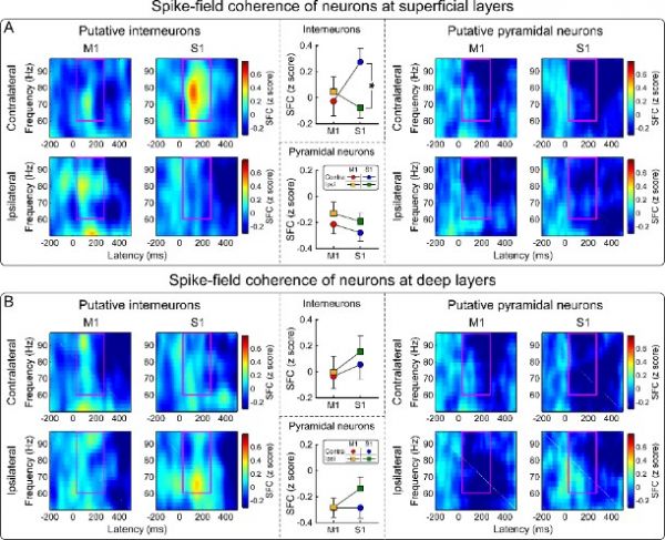 为克服脑电研究的这些缺点、深入探究疼痛诱发GBO的脑内神经来源,中国科学院心理健康重点实验室的岳路鹏博士和胡理研究员开发了同步记录动物皮层脑电(ECoG)和多脑区脑内神经活动的实验范式。在给大鼠施加激光疼痛刺激的同时,同步记录大鼠ECoG和双侧S1和M1不同深度的神经电生理信号,通过分析脑内局部场电位(local field potential,LFP)和神经元放电(spikes)与ECoG信号的关系来揭示GBO的神经起源,发现ECoG记录到的疼痛诱发GBO来源于疼痛刺激对测S1的浅层中间神经元。