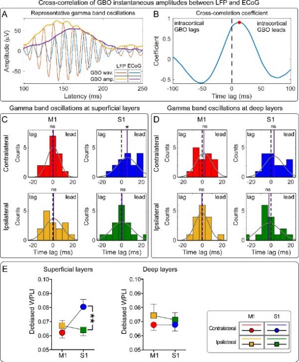 第二,位于伤害性疼痛刺激对侧的S1浅层LFP与ECoG所观测到的GBO具有最高的相位相关性,且仅S1浅层内的疼痛诱发GBO在发生时间上早于ECoG记录到的GBO(图1)。