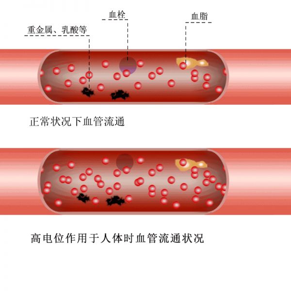 使用高电位治疗仪进行治疗时,因高压的作用,会在人体周围产生大量的空气负离子,并通过人的口、鼻及皮肤的呼吸而进入人体,中和血液的酸性,逐渐调节血液的PH值,使之趋向弱碱性状态。在这一过程中,负离子对血液的净化作用主要变现在两个方面:A,使血液酸碱度降低,血液的粘稠度也会随之降低,色泽逐步恢复正常,血液循环趋好,各种毒素容易排泄出来;B,中和血液中及血管壁上的酸性粥样(难溶物)杂质,使之分解并溶解后容易排泄出来。