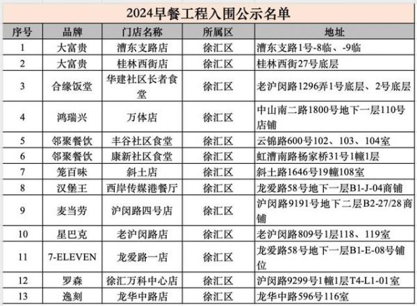 徐汇区2024年新增13家市级早餐工程示范点名单