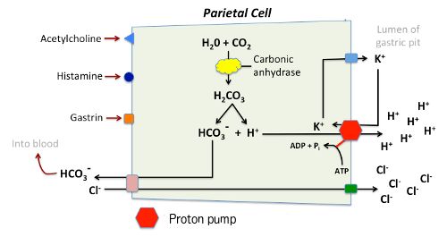 至于酸性,对于我们哺乳动物来说,是唯一可以有所抵抗的,但是仅限于偏酸的食品和饮品,浓硫酸浓盐酸等强酸已经不再是我们所能承受的了。我们的消化道表面有一层由细胞分泌的粘膜,这层粘膜可以保护我们的消化道表面的上皮细胞免受酸性或碱性物质的腐蚀。此外,上皮细胞本身就属于极为结实抗造的细胞类群,进一步扩大了我们对不同酸碱性食物的耐受性。不仅如此,我们的胃中还充盈着胃酸,一个主要由盐酸和蛋白酶组成的pH值低至1.5~3.5的液体(想不到吧,我们自己胃也会分泌盐酸, H+ 主要来源于壁细胞(parital cells)),pH2.7的可乐等酸性饮料食物在胃酸面前不过是小巫见大巫,在经过胃消化之后,与胃酸一道进入十二指肠,在这里与肠道分泌的碳酸氢钠相中和,成为相对碱性的混合物并最终被吸收或排出体外。