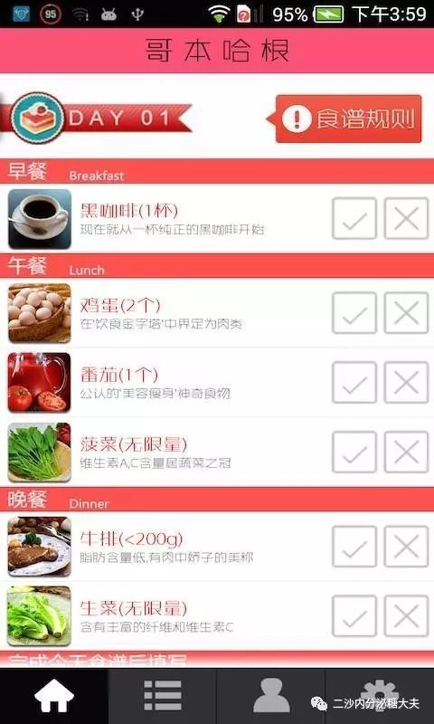 我国的轻体力劳动男性(体重60kg),一天应摄入热量 2200 千卡,女性应摄入 1800 千卡。而哥本哈根饮食平均每天只允许摄入大约 600 千卡,营造出至少 1200 千卡的热量差,13 天会让你亏空至少 15600 千卡的热量,这就是短时间减重的秘诀所在:低热量摄入。