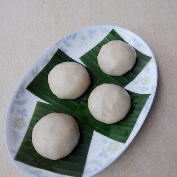 8:取一片香蕉叶,抹上少量油,再将包的茶果放在上面;