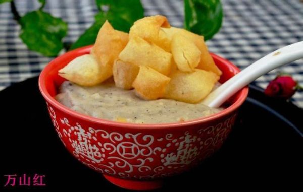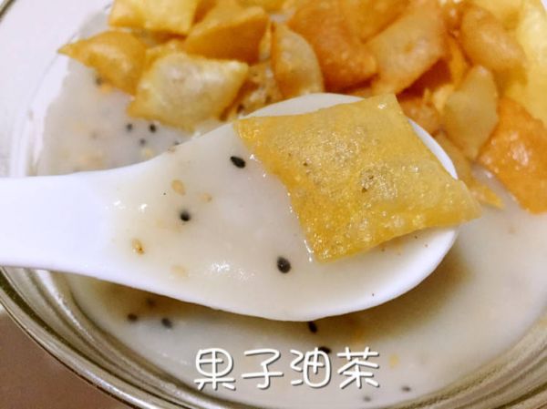13:煮好的油茶盛入碗中后撒上炸的酥脆的面筋泡,享用吧
