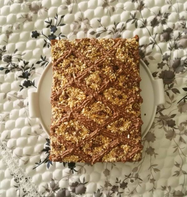 8:在顶部用裱花嘴挤出条状纹路,中间撒上混合的腰果碎花生碎黑巧克力碎